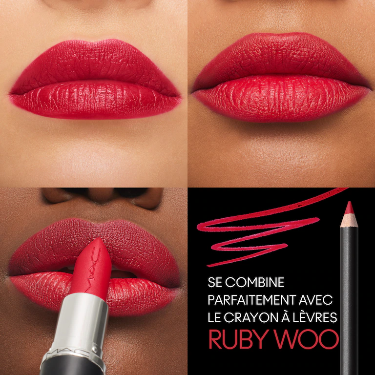 Notre rouge à lèvres emblématique a été maximisé pour donner PLUS aux lèvres avec un fini mat soyeux et une formule bonne pour les lèvres qui paraît plus riche, est plus agréable à porter et dure plus longtemps. Obtenez PLUS DE COULEUR avec une couvrance complète et un rendu hautement pigmenté avec notre plus large gamme de [40] teintes approuvées par les artistes. Offrez-vous PLUS DE CONFORT avec un mélange crémeux d’huile de coco, de beurre de karité bio et de beurre de cacao bio qui revitalise et nourrit les lèvres. Obtenez PLUS DE SOIN avec une hydratation instantanée et pendant 8 heures. Obtenez une TENUE PROLONGÉE avec 12 heures de couleur longue tenue qui ne s’estompe pas et laisse les lèvres visiblement plus pulpeuses dès le premier passage. Obtenez un look PLUS LUXUEUX avec un étui haute brillance à l’extérieur et une bulle en relief M·A·C à l’intérieur. Et enfin, soyez PLUS RESPONSABLE avec un étui de rouges à lèvres composé d’au moins 30% de matériau PCR. Le rouge à lèvres mat emblématique qui a changé le monde dans lequel nous vivons a peut-être été réinventé, mais chaque teinte célèbre et fraîche dégage toujours ce parfum vanillé signature que vous aimez déjà (ou que vous allez bientôt aimer….).
