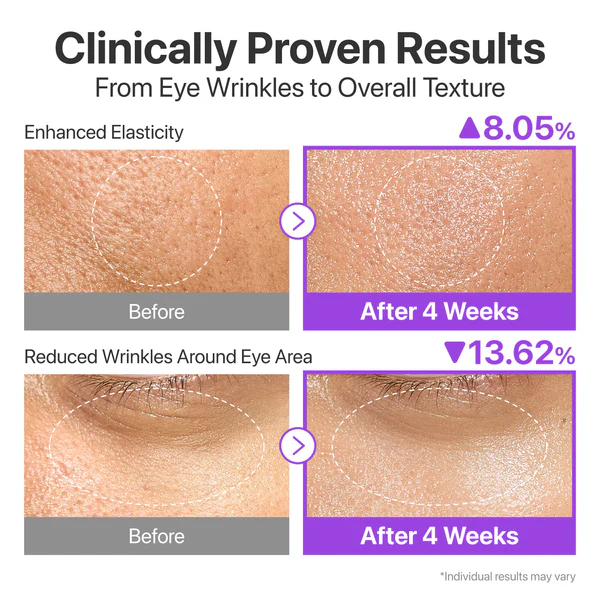 مُثبتة سريرياً في تقليل 11 نوعاً من التجاعيد (تجاعيد الجبين، تجاعيد العبوس، تجاعيد حول العينين، أخاديد الدمع، خطوط الأرنب، خطوط الشفاه، خطوط الابتسامة، خطوط الماريونيت، تجاعيد الفم السفلية، تجاعيد الذقن، وخطوط الرقبة) في 4 أسابيع فقط